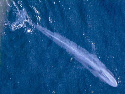 Blue whales are simply enormous. A blue whale heart is the size of a small car and pumps 10 tons of blood through the massive blue whale body. A blue whale aorta (the main blood vessel) alone is large enough for a human to crawl through. In the Antarctic, blue whales have reportedly reached lengths of 110 feet, but most probably grow to between 80 and 90 feet long. They can weigh over 200 tons or 400,000 pounds! Female blue whales are generally larger than males, and northern hemisphere blue whales are generally smaller than those in the southern hemisphere. Blue whales are light bluish gray on their dorsal side and mottled gray whitish on their bellies. Some have yellowish bellies.
