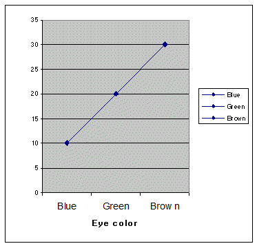 There are 60 kids in the class room; 10 have blue eyes, 20 have green eyes, 30 have brown eyes. Make a line graph of the color of eyes vs. the number of kids.